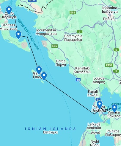 Die Segelroute von Korfu nach Preveza ist besonders angenehm, da sie in der Regel das Segeln mit dem Wind ermöglicht. Unterwegs besuchen wir die Inseln Paxos und Antipaxos sowie Ziele auf dem Festland wie Parga und Sivota. Diese Einweg-Route bietet mehr Zeit zur Erkundung, da keine Rückfahrt erforderlich ist. Allerdings können zusätzliche Kosten anfallen, da die Yacht möglicherweise nach Korfu zurückkehren muss.